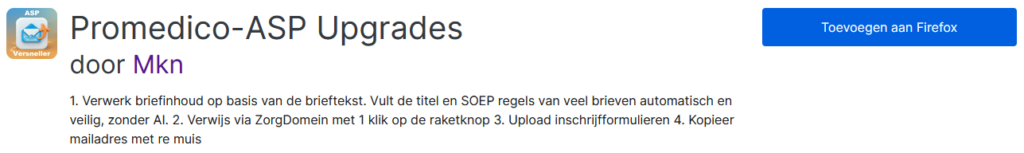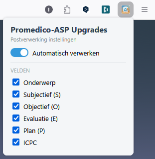 Promedico-ASP upgrades is een extensie die draait in de Firefox browser. Hieronder vindt u een overzicht van de functies.
