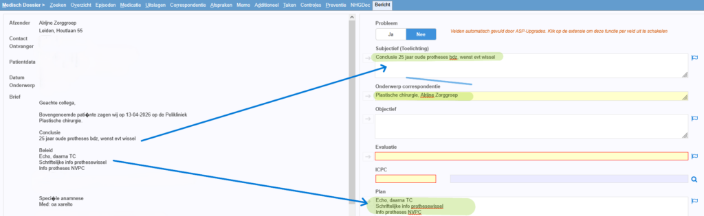 Een extensie die de medische post automatisch analyseert en u helpt door het voorinvullen van de postverwerkingsvelden? Dat is nu mogelijk. Zonder AI dus zonder hallucinaties en zonder verzenden van gegevens. De post wordt doorzocht op termen als ‘conclusie’, ‘plan’, ‘beleid’ en onderdelen die vaak de naam en functie van de afzender of het soort bericht bevatten. De alinea na het woord ‘conclusie’ wordt bijvoorbeeld naar Subjectief (Toelichting) gekopieerd. Vanwege het ontbreken van deze termen in sommige brieven is voorinvullen niet altijd mogelijk.